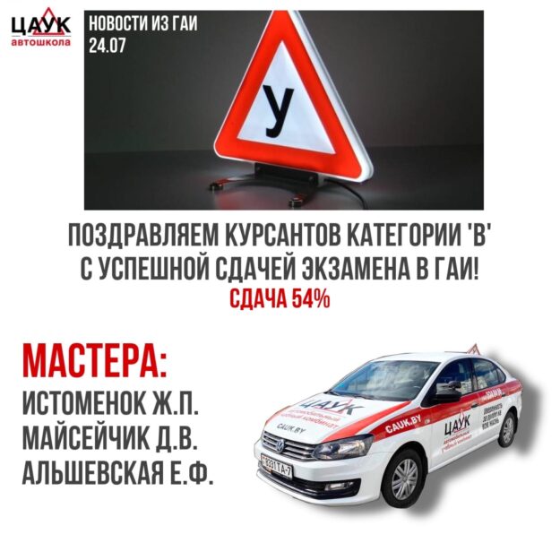 Поздравляем курсантов Категории «В» с успешной сдачей экзамена в ГАИ! (сдача 54%)