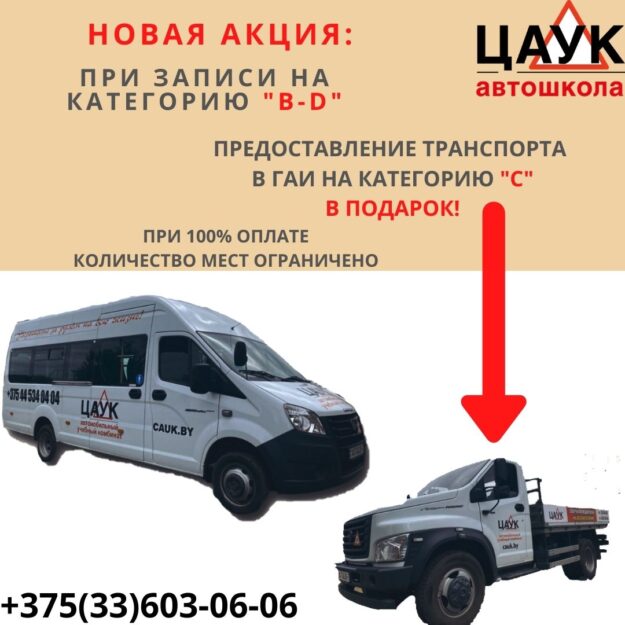 При записи на категорию «В-D» , получите предоставление транспорта в ГАИ на категорию «С» в подарок!