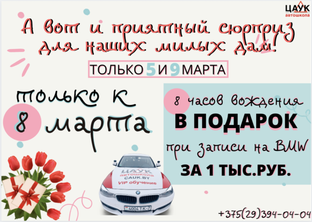 Подарки от Автошколы ЦАУК к 8 марта! Акции, НовостиАвтор: nikvik-admin04.03.2021 Акция действует 5 и 9 марта!
