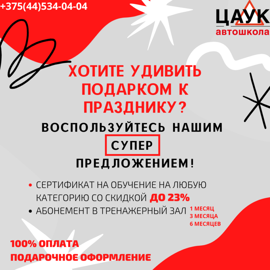 Подарите сертификат на обучение в Автошколе ЦАУК или абонемент в наш новый тренажёрный зал «SportHouse ЦАУК»!