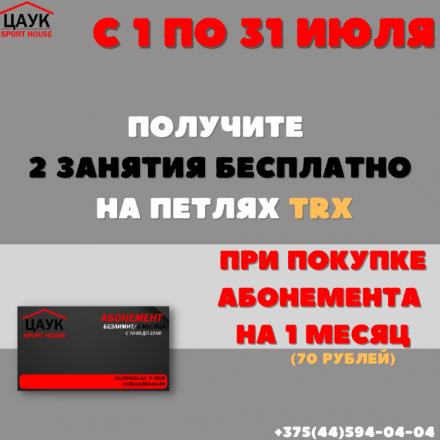 Получите 2 занятия бесплатно на петлях TRX, при покупке абонемента на 1 месяц!